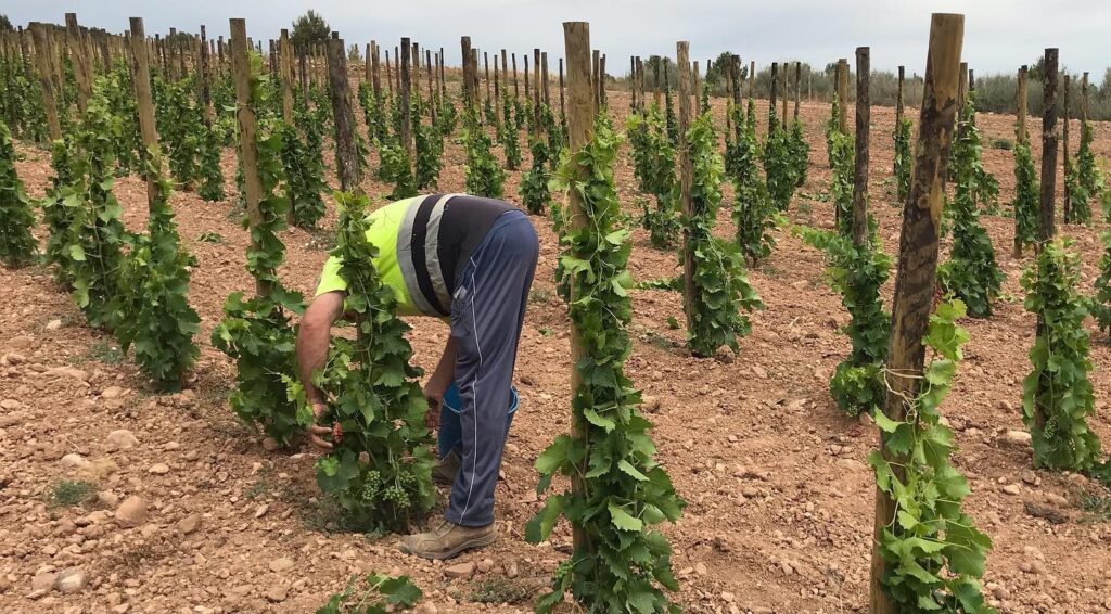 彼らが所有する畑は、海抜360mから380mに位置する10区画、トータルで6haです 。一番標高の高い区画はヤサ・デ・ラ・クエヴァで、450mに達します 。ブドウ栽培は完全オーガニックにて行われ 、仕立ては基本的にゴプレ(株仕立て)で、接ぎ木なしの自根が主です 。畑仕事はカルロス氏と彼の父親の二人で行われています 。土壌は基本的に石灰ベースの砂質土壌で、雨が少なく有機質の少ない乾燥した環境にあります 。